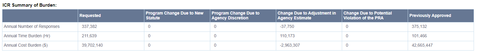 Increases in estimated burden hours due to increasing estimate of time to complete various items in the information collection. The total estimated burden hours have increased from 101,466 in the 2017 renewal to 211,639 for the current renewal due to overall increases in estimated annual responses.