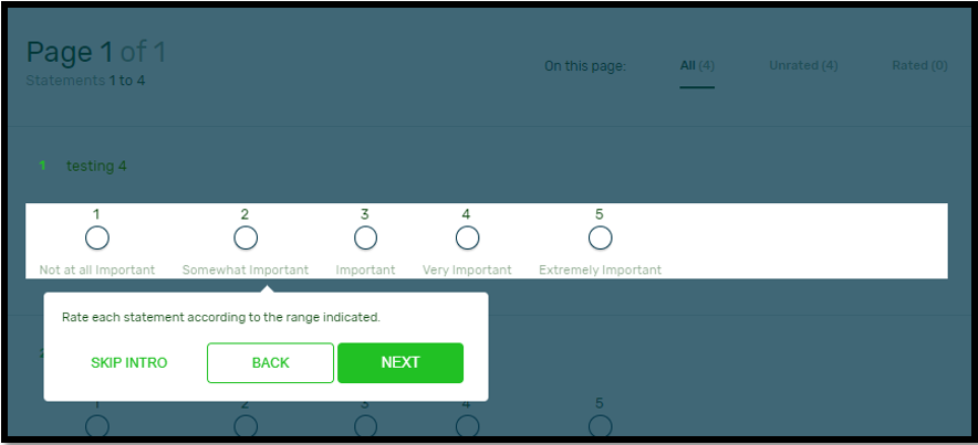For the rating activity, respondents will be asked to rate statements according to importance and usefulness. At the beginning of the activity, respondents will see the importance section of the rating activity general instructions message as illustrated in Exhibit 6a.
