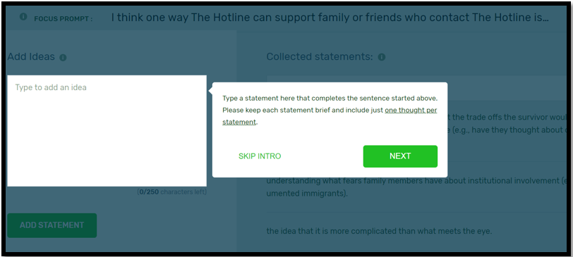 * Instructions in screenshot: “Type a statement here that completes the sentence started above. Please keep each statement brief and include just one thought per statement.” NOTE: All example statements shown under “Collected statements” in the screen shot below will be removed before data collection. Actual brainstormed statements (from participants, the literature review, and advocate interviews) will be viewable by participants should they wish to see examples.
