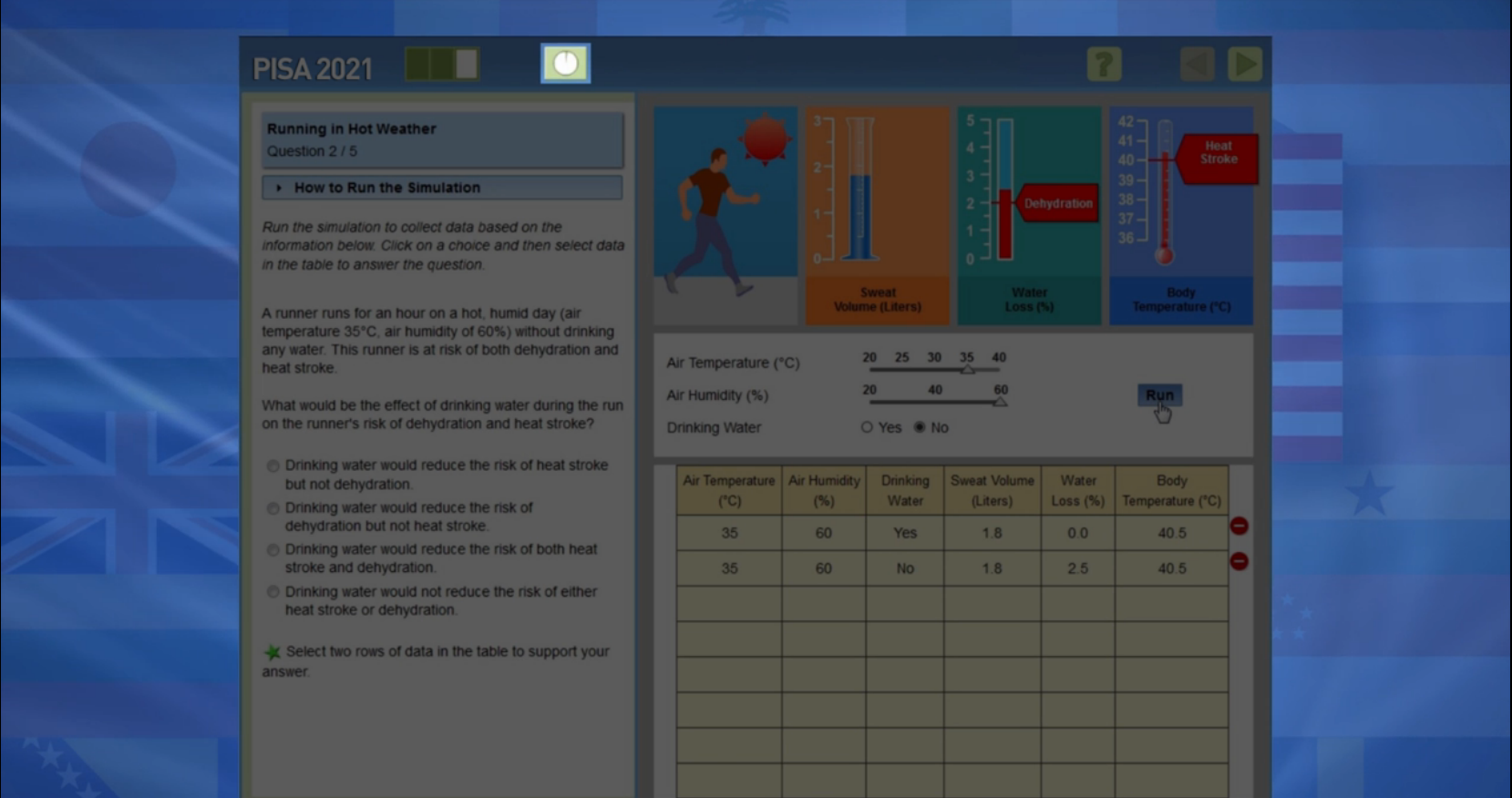 Many of the PISA questions are designed to simulate experiments, letting you manipulate different variables or conditions to produce data that will help you answer the question.