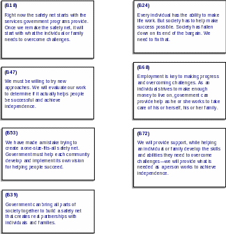 Now, I would like you to take a few minutes to think about how you or people you know interact with government and community programs that make up the safety net. You are in charge of “Remaking the Safety Net.” It can be anything you want or need it to be.