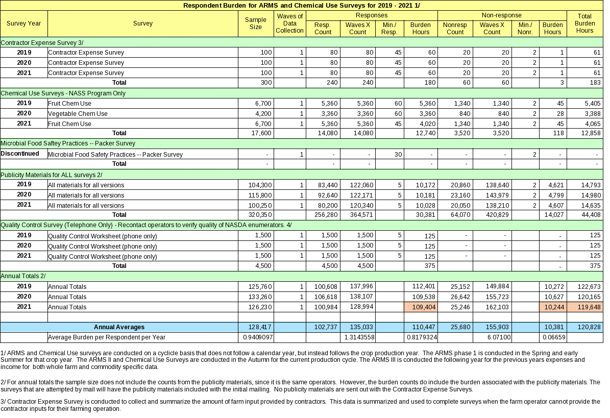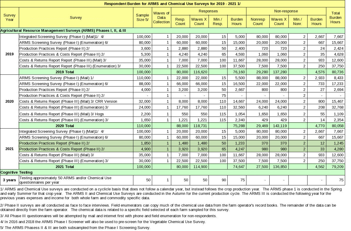 The ARMS 2, Fruit Chemical Use Surveys, and cooperator surveys are done by mail, phone and field enumeration. These changes to the questionnaire’s content will not change anything as far as use of technology from what was previously approved. The ARMS 3 surveys are available by internet, mail, phone, and field enumeration.