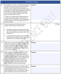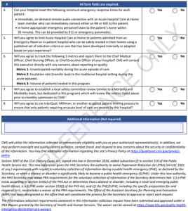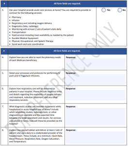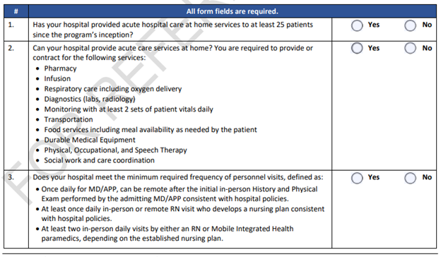 When a hospital submits a waiver request, it completes one of two online forms found on the waiver landing page (https://qualitynet.cms.gov/acute-hospital-care-at-home), depending on its level of experience with this type of care. Experienced hospitals, defined as treating at least 25 patients with acute hospital care at home previously, have an expedited submission that is based on a series of attestations, seen below: