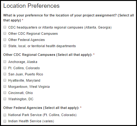 NCHS / Division of Health Interview Statistics / Data Analysis & Quality Assurance Branch CSELS / Division of Scientific Education and Professional Development / Education and Training Se... NCHHSTP / Division of Tuberculosis Elimination / Data Management and Statistics Branch NIOSH / Pittsburgh Mining Research Division / Electrical & Mechanical Systems Safety Branch NCHS / Division of Health Interview Statistics / Data Production & Systems Branch CPR / Division of Emergency Operations / Emergency and Risk Communications Branch NCEZID / Division of Vector-Borne Diseases / Dengue Branch NCEH / Division of Environmental Health Science and Practice / Emergency Management, Radiation, a... NCBDDD / Division of Congenital and Developmental Disorders / Developmental Disabilities Branch NCEZID / Division of Preparedness and Emerging Infections / Emergency Preparedness and Response B... NCBDDD / Division of Human Development and Disability / Disability and Health Branch CGH / Division of Global Health Protection / Emergency Response and Recovery Branch NIOSH / Division of Compensation Analysis & Support / Division of Compensation Analysis & Support NCEH / Division of Laboratory Science / Emergency response branch NCCDPHP / Division of Oral Health / Division of Oral Health ATSDR / Division of Toxicology and Human Health Sciences / Emergency Response Program NIOSH / Health Effects Laboratory Division / Engineering & Control Branch NIOSH / Division of Applied Research & Technology / Engineering & Physical Hazards Branch NCEZID / Division of Foodborne, Waterborne and Environmental Diseases / Enteric Diseases Epidemio... NCEZID / Division of Foodborne, Waterborne and Environmental Diseases / Enteric Diseases Laborato... CGH / Division of Parasitic Diseases and Malaria / Entomology Branch ATSDR / Division of Toxicology and Human Health Sciences / Environmental Epidemiology Branch NCCDPHP / Division of Population Health / Epidemiology and Surveillance Branch NCEH / Division of Emergency and Environmental Health Services / Environmental Health Services Br... ATSDR / Division of Toxicology and Human Health Sciences / Environmental Health Surveillance Branch NCHHSTP / Division of Viral Hepatitis / Epidemiology and Surveillance Branch ATSDR / Division of Toxicology and Human Health Sciences / Environmental Medicine Branch NCHHSTP / Division of HIV/AIDS Prevention Surveillance & Epidemiology / Epidemiology Branch NCEH / Division of Emergency and Environmental Health Services / Environmental Public Health Read... NCCDPHP / Office on Smoking and Health / Epidemiology Branch ATSDR / Division of Toxicology and Human Health Sciences / Environmental Toxicology Branch NCEZID / Division of Healthcare Quality Promotion / Epidemiology Research and Innovations Branch NCCDPHP / Division of Cancer Prevention and Control / Epidemiology and Applied Research Branch CSELS / Division of Scientific Education and Professional Development / Epidemiology Workforce Br... NCIRD / Influenza Division / Epidemiology and Prevention Branch CGH / Division of Global Health Protection / Epidemiology, Informatics, Surveillance and Lab Branch NCCDPHP / Division of Diabetes Translation / Epidemiology and Statistics Branch NIOSH / National Personal Protective Technology Laboratory / Evaluation & Testing Branch NCHHSTP / Division of Sexually Transmitted Disease Prevention / Epidemiology and Statistics Branch NIOSH / Health Effects Laboratory Division / Exposure Assessment Branch NCCDPHP / Division for Heart Disease and Stroke Prevention / Epidemiology and Surveillance Branch NCHHSTP / Division of Sexually Transmitted Disease Prevention / Field Services Branch NCBDDD / Division of Blood Disorders / Epidemiology and Surveillance Branch CPR / Division of State and Local Readiness / Field Services Branch CGH / Division of Global HIV and TB / Epidemiology and Surveillance Branch NCHHSTP / Division of Tuberculosis Elimination / Field Services Branch NIOSH / Respiratory Health Division / Field Studies Branch NCCDPHP / Division of Reproductive Health / Field Support Branch