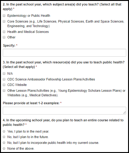 NCHS / Division of Health Interview Statistics / Data Analysis & Quality Assurance Branch CSELS / Division of Scientific Education and Professional Development / Education and Training Se... NCHHSTP / Division of Tuberculosis Elimination / Data Management and Statistics Branch NIOSH / Pittsburgh Mining Research Division / Electrical & Mechanical Systems Safety Branch NCHS / Division of Health Interview Statistics / Data Production & Systems Branch CPR / Division of Emergency Operations / Emergency and Risk Communications Branch NCEZID / Division of Vector-Borne Diseases / Dengue Branch NCEH / Division of Environmental Health Science and Practice / Emergency Management, Radiation, a... NCBDDD / Division of Congenital and Developmental Disorders / Developmental Disabilities Branch NCEZID / Division of Preparedness and Emerging Infections / Emergency Preparedness and Response B... NCBDDD / Division of Human Development and Disability / Disability and Health Branch CGH / Division of Global Health Protection / Emergency Response and Recovery Branch NIOSH / Division of Compensation Analysis & Support / Division of Compensation Analysis & Support NCEH / Division of Laboratory Science / Emergency response branch NCCDPHP / Division of Oral Health / Division of Oral Health ATSDR / Division of Toxicology and Human Health Sciences / Emergency Response Program NIOSH / Health Effects Laboratory Division / Engineering & Control Branch NIOSH / Division of Applied Research & Technology / Engineering & Physical Hazards Branch NCEZID / Division of Foodborne, Waterborne and Environmental Diseases / Enteric Diseases Epidemio... NCEZID / Division of Foodborne, Waterborne and Environmental Diseases / Enteric Diseases Laborato... CGH / Division of Parasitic Diseases and Malaria / Entomology Branch ATSDR / Division of Toxicology and Human Health Sciences / Environmental Epidemiology Branch NCCDPHP / Division of Population Health / Epidemiology and Surveillance Branch NCEH / Division of Emergency and Environmental Health Services / Environmental Health Services Br... ATSDR / Division of Toxicology and Human Health Sciences / Environmental Health Surveillance Branch NCHHSTP / Division of Viral Hepatitis / Epidemiology and Surveillance Branch ATSDR / Division of Toxicology and Human Health Sciences / Environmental Medicine Branch NCHHSTP / Division of HIV/AIDS Prevention Surveillance & Epidemiology / Epidemiology Branch NCEH / Division of Emergency and Environmental Health Services / Environmental Public Health Read... NCCDPHP / Office on Smoking and Health / Epidemiology Branch ATSDR / Division of Toxicology and Human Health Sciences / Environmental Toxicology Branch NCEZID / Division of Healthcare Quality Promotion / Epidemiology Research and Innovations Branch NCCDPHP / Division of Cancer Prevention and Control / Epidemiology and Applied Research Branch CSELS / Division of Scientific Education and Professional Development / Epidemiology Workforce Br... NCIRD / Influenza Division / Epidemiology and Prevention Branch CGH / Division of Global Health Protection / Epidemiology, Informatics, Surveillance and Lab Branch NCCDPHP / Division of Diabetes Translation / Epidemiology and Statistics Branch NIOSH / National Personal Protective Technology Laboratory / Evaluation & Testing Branch NCHHSTP / Division of Sexually Transmitted Disease Prevention / Epidemiology and Statistics Branch NIOSH / Health Effects Laboratory Division / Exposure Assessment Branch NCCDPHP / Division for Heart Disease and Stroke Prevention / Epidemiology and Surveillance Branch NCHHSTP / Division of Sexually Transmitted Disease Prevention / Field Services Branch NCBDDD / Division of Blood Disorders / Epidemiology and Surveillance Branch CPR / Division of State and Local Readiness / Field Services Branch CGH / Division of Global HIV and TB / Epidemiology and Surveillance Branch NCHHSTP / Division of Tuberculosis Elimination / Field Services Branch NIOSH / Respiratory Health Division / Field Studies Branch NCCDPHP / Division of Reproductive Health / Field Support Branch