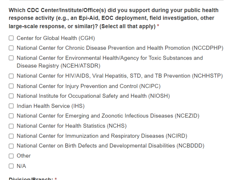 Change type: Question revision Change question to: Which CDC Center/Institute/Office(s) did you support during your public health response activity (e.g., an Epi-Aid, EOC deployment, field investigation, other large-scale response, or similar)? (Select all that apply) |
