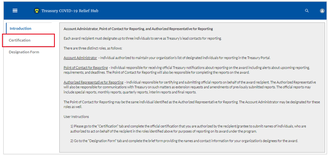 Account Administrator for the SLFRF award has the administrative role of maintaining the names and contact information of the designated individuals for SLFRF reporting. The Account Administrator is also responsible for working within your organization to determine its designees for the roles of Point of Contact for Reporting and Authorized Representative for Reporting and providing their names and contact information via Treasury’s Portal. Finally, the Account Administrator is responsible for making any changes or updates to the user roles as needed over the award period. We recommend that the Account Administrator identify an individual to serve in his/her place in the event of staff changes.