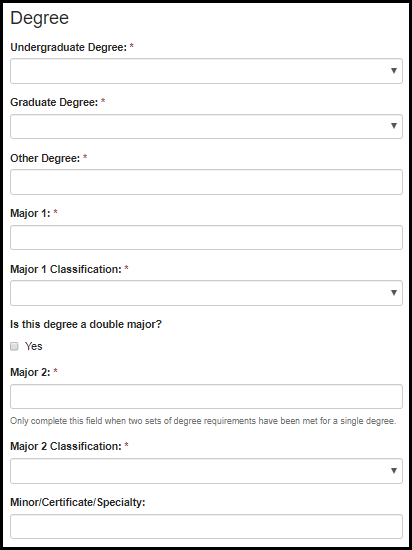 Biological, biomedical, or animal sciences Business, management Community health, public health Decision or quantitative sciences Economics (agricultural, applied, health) Engineering, industrial engineering, operations research Environmental, occupational sciences Epidemiology Global, international health Health education Informatics (public health, clinical, nursing) Health services administration, health policy analysis Health services research, quantitative policy analysis Information technology, information science, computer science Liberal arts, general studies, humanities, language, literature Maternal and child health Mathematical sciences, statistics, biostatistics Physical or chemical sciences Political science, law Public administration, policy analysis Social/behavior science (anthropology, social work, psychology) Other
