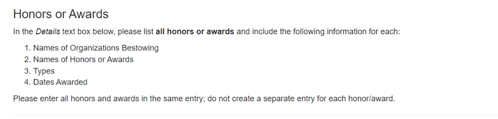 For each relevant section add instructional text that says, Please enter all publications in the same entry; do not create a separate entry for each publication. Please enter all presentations in the same entry; do not create a separate entry for each presentation. Please enter all grants in the same entry; do not create a separate entry for each grant. Please enter all honors and awards in the same entry; do not create a separate entry for each honor/award. Please enter all monographs or reports in the same entry; do not create a separate entry for each monograph or report. Please enter all research grants in the same entry; do not create a separate entry for each research grant. Please enter all working papers (job market papers) in the same entry; do not create a separate entry for each working paper. |