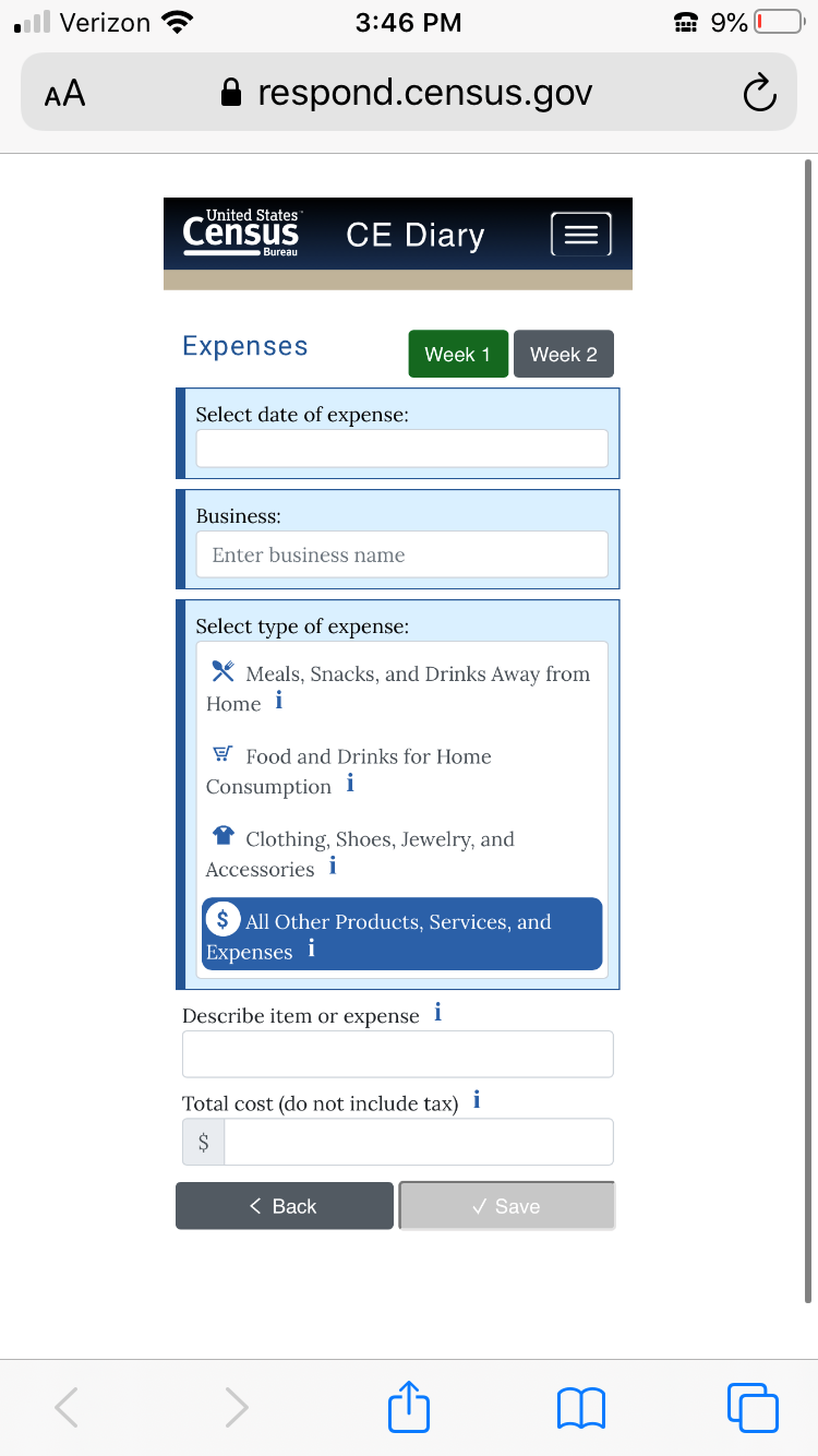 On the last day of the reporting period for each week (datebegin + 6 and datebegin + 13), BLS would like a new item added to the Summary screen for users who have logged in, but have not entered any expenses for that week. In this situation, they would like to have a checkbox added for respondents who did not have any expenses during the reporting week.
