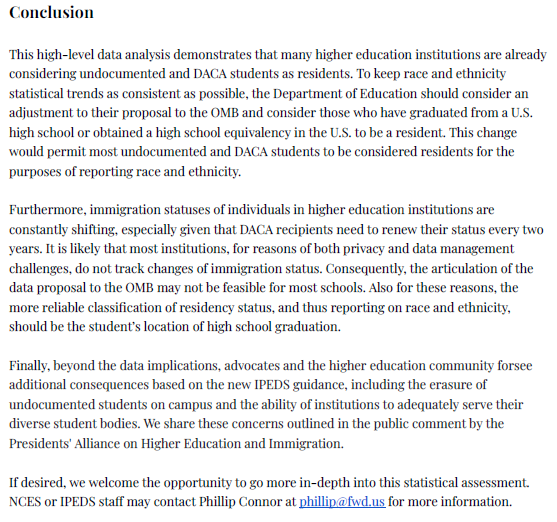 The attached analysis indicates that higher education institutions do need guidance on how to better report undocumented students using IPEDS. Comparisons to augmented 2019 American Community Survey (ACS) data suggests that the reporting of undocumented students through IPEDS is not consistently applied by all schools.