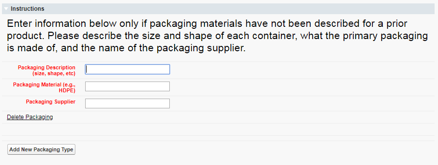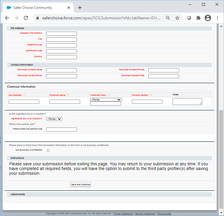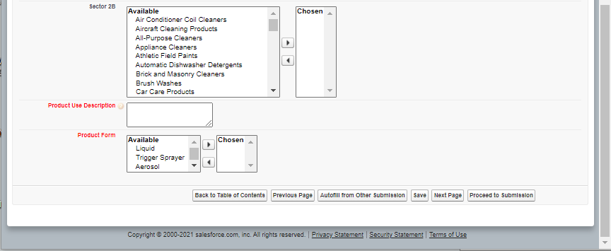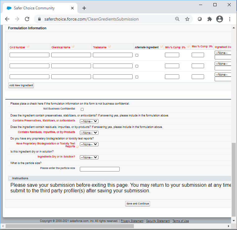 Following are screenshots from the Product and Ingredient Submission forms in the Safer Choice Community cloud-based Salesforce data system. Please refer to Section 12b, IC #1 for a full list of data items collected. Note that the specific details of the screenshots may change over time as the Safer Choice program improves and/or modifies the system. However, the general and fundamental components of the Salesforce system will be similar to what is presented in the following screenshots.