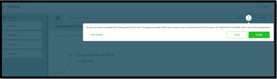 * Text in screen shot: “You do not need to complete the sorting activity all at once. The piles you create will be auto-saved so you can leave the activity and log-in at a later time to complete with a username and password.” NOTE 1: Anonymous participants will not see these directions. NOTE 2: All example statements under “Cards” will be removed before data collection.