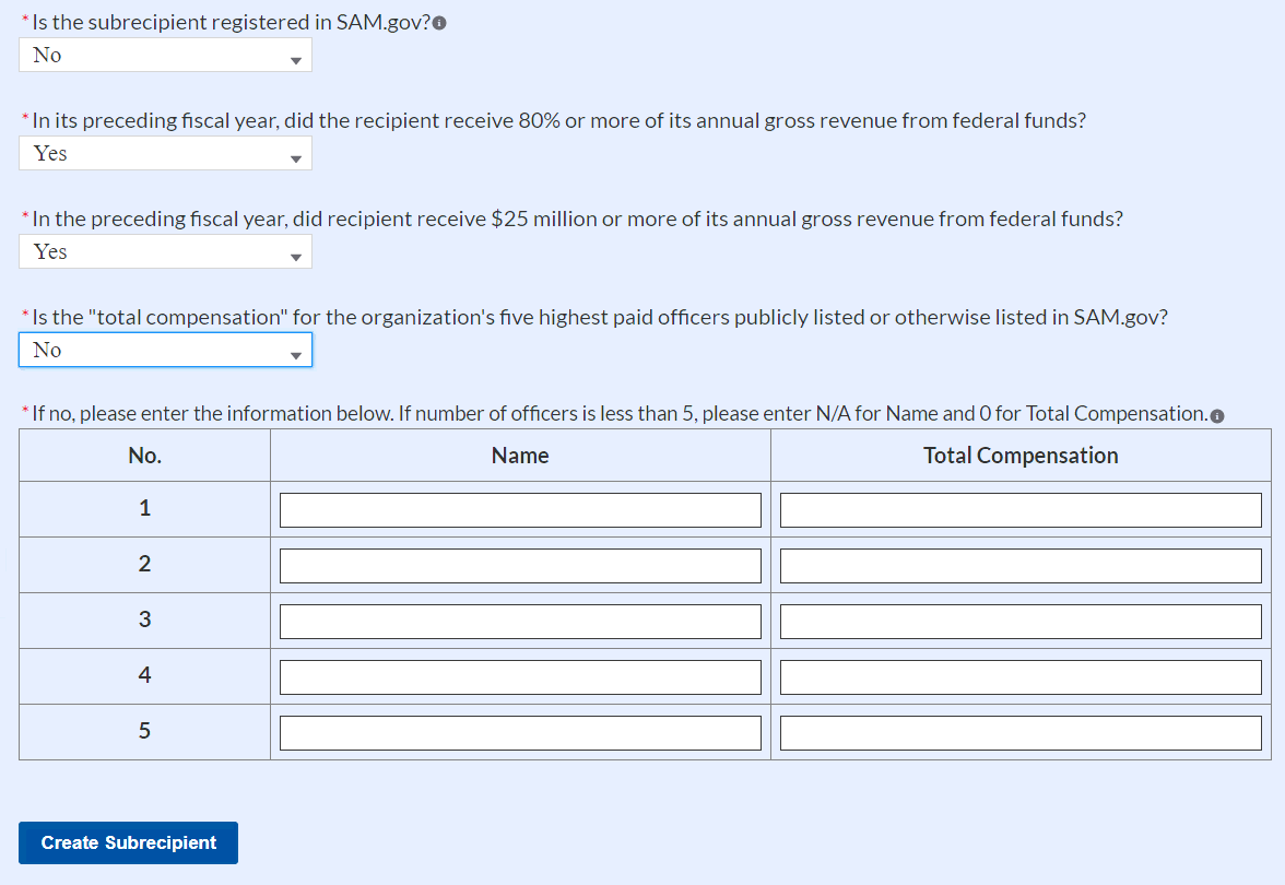Figure 45 Additional SAM.gov questions for Subrecipients, Contractors, and Beneficiaries 40