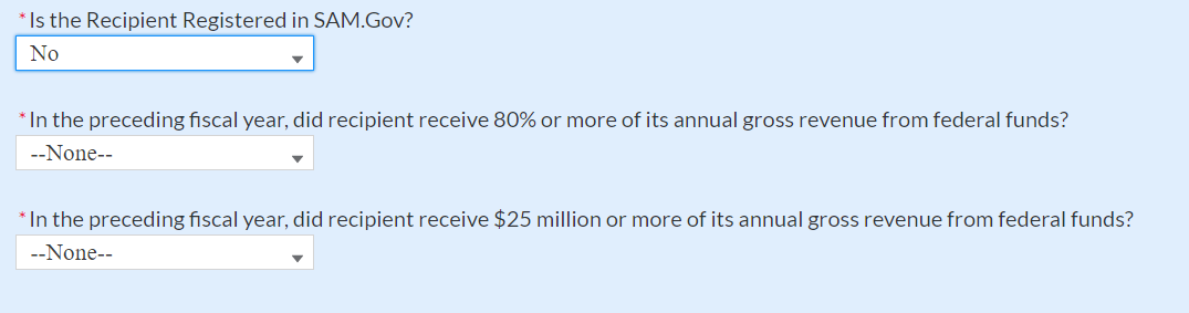 Figure 45 Additional SAM.gov questions for Subrecipients, Contractors, and Beneficiaries 40