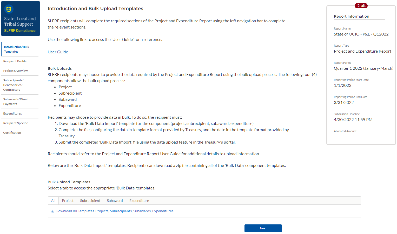 Recipients that are not subject to quarterly reporting will be required to submit a Project and Expenditure Report by April 30, 2022.