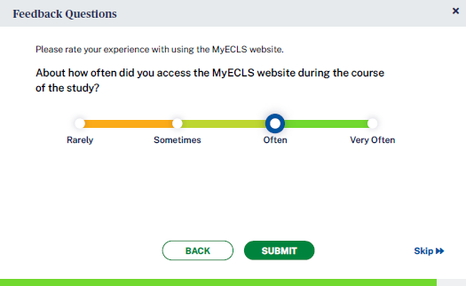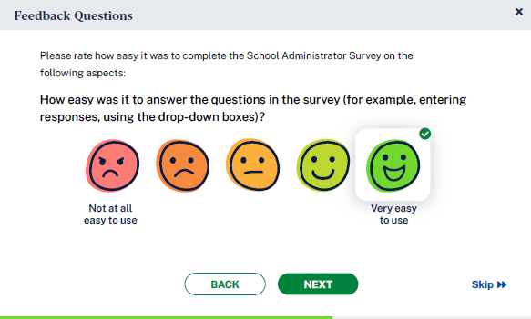 Note that, for all feedback questions, if the next button is selected without selecting a response or ‘skip,’ the following message displays: