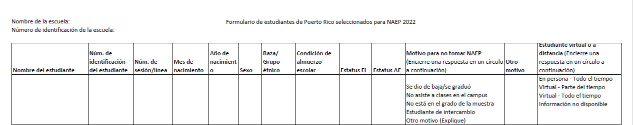 Formulario de estudiantes de Puerto Rico seleccionados para NAEP