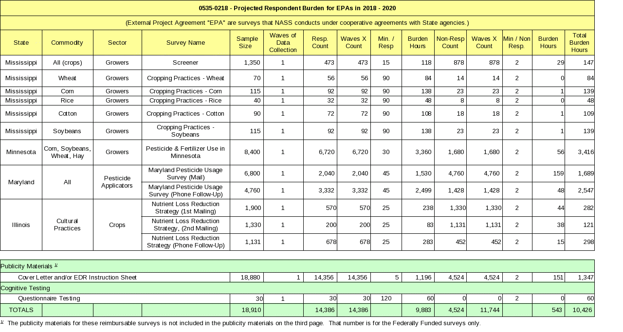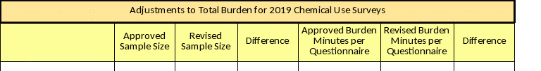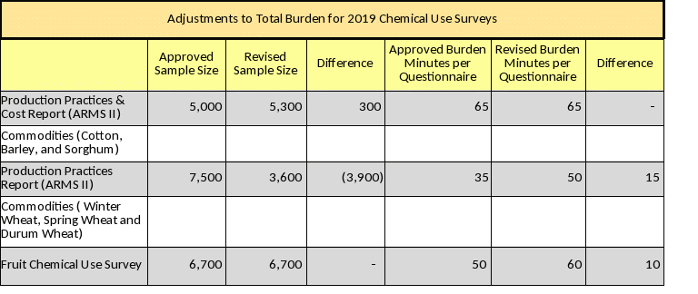 OPMP came to NASS wanting to incorporate additional pest management questions into the ARMS II Production Practices Reports. The PPR surveys for 2019 will be for winter, spring and durum wheat questionnaires, the new questions will be in Section E, Pest Management Practices, questions number 17 – 29. In addition, OPMP requested that similar pest management questions be added to the Fruit Chemical Use Survey which will also be conducted in 2019. The PPR and the fruit questionnaires are already approved to collect data that is related to Pest Management; OPMP needs additional detail to be included in the 2019 questionnaires. The PPR respondent burden was increased from 35 minutes per completed response to 50 minutes and for the Fruit Chemical Use Survey, the respondent burden was increased from 50 minutes to 60 minutes. However the overall sample size was reduced by 1,200. The net change in annual respondent burden is reflected in the table below.
