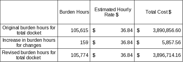 The following table contains the estimated burden hours for the surveys included in this supplemental supporting statement. Cost to the public for completing the questionnaire is assumed to be comparable to the hourly rate of those requesting the data. The adjusted overall cost to the public is estimated at $3,896,714.16.