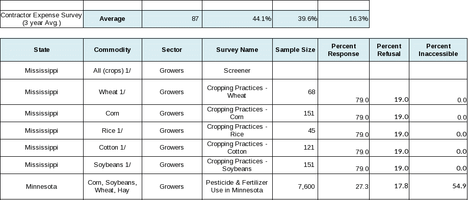 The universe for the new Minnesota cooperative survey is all active agricultural operations in Minnesota that grow corn or soybeans. The universe is determined by active farms on the NASS List Frame for Minnesota. The sampling frame will be stratified corn and soybean acres as a measure of size. The sampling frame will be sorted by county before a systematic random sample is drawn. The sample size will be 7,600. Phone follow-up contacts for non-respondents will be done to ensure a high level of coverage for each Minnesota Department of Agriculture’s Pesticide Management Areas (PMA), and Nitrogen Best Management Practices (BMP).