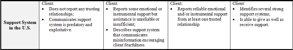 legal issues and, if so, whether or not the client has the knowledge, skills and resources to represent themselves or access legal services and work with an attorney to pursue their immigration legal case. Use the SOT-PWI-S or convert your program tool’s assessment measure to the SOT-PWI-S levels of need for this domain.