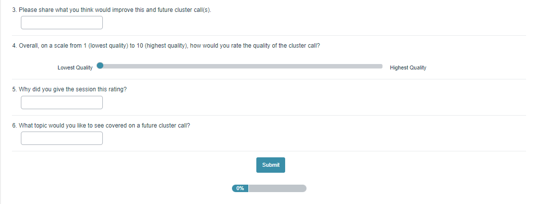 Please share what you liked most about the webinar/cluster call. (Open field)