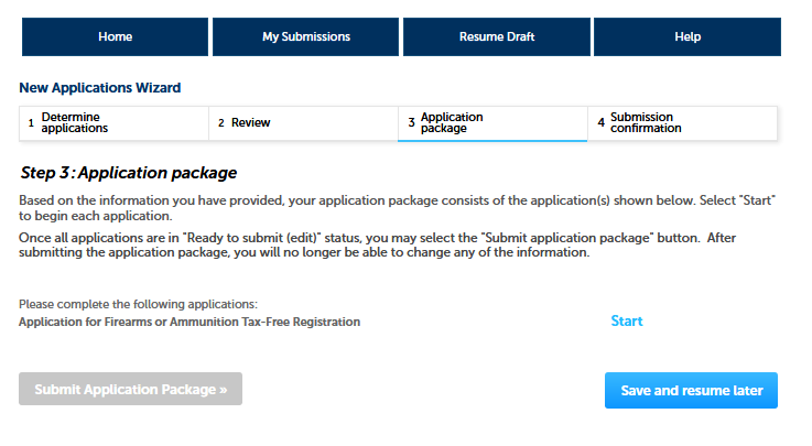 After editing and/or confirming previous information, respondenst then may select “Start” to immediately complete the application package, or may select “Save and resume later” to complete the application package later: