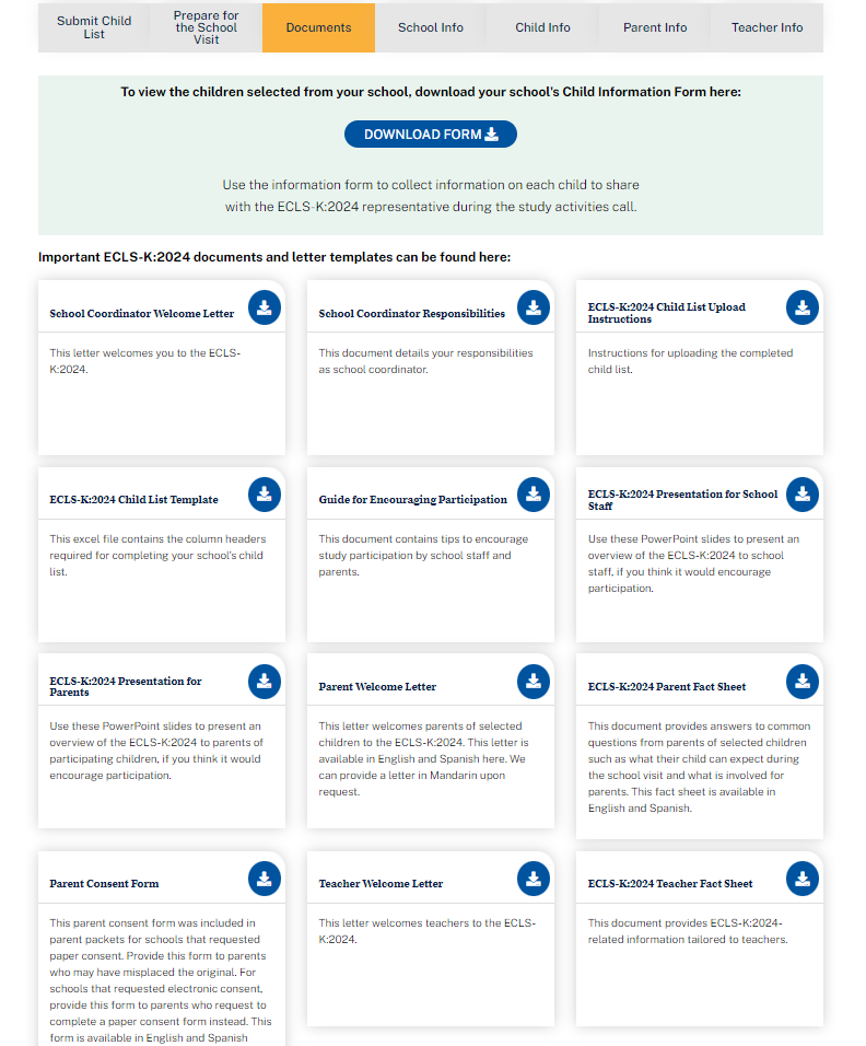 Para conocer más sobre el ECLS-K:2024, por favor descargue los siguientes documentos, avance para ver resultados de estudios anteriores o regrese a la página principal de MyECLS, para más información sobre el estudio: