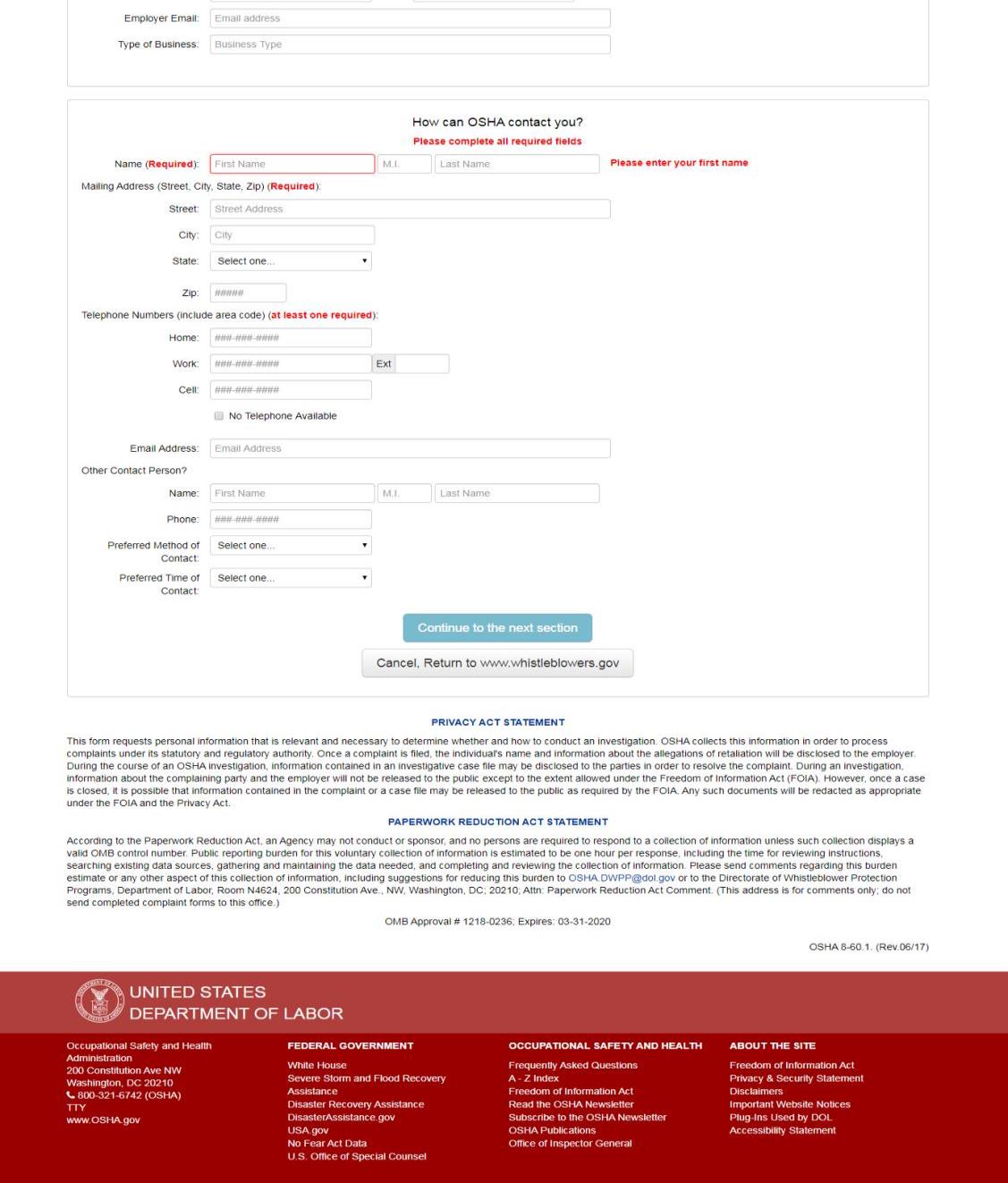 OSHA Whistleblowers Online Complaint Form