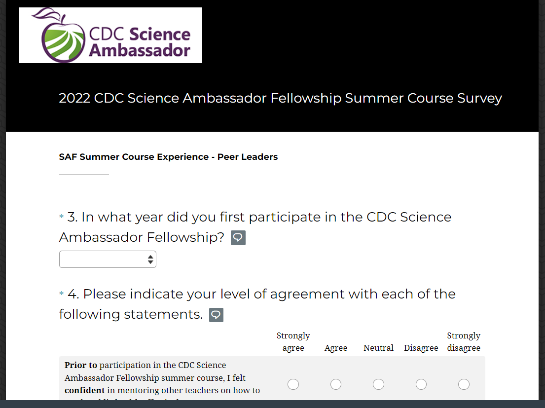 Attachment 2. 2022 CDC Science Ambassador Fellowship Summer Course Satisfaction Survey Screenshots