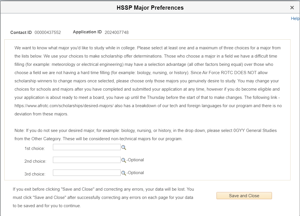 MAJOR PREFERENCES (To be completed by HSSP Applicants Only)