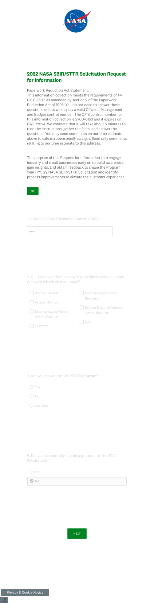 NASA SBIR/STTR Request for Information/Customer Experience Survey