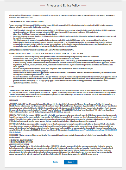 Below are screenshots from the Defense Travel System (eff. 08/10/2017) that display the privacy and ethics policy and disclaimer along with the data entry fields requesting personal information; this in support of the OMB Control Number request.
