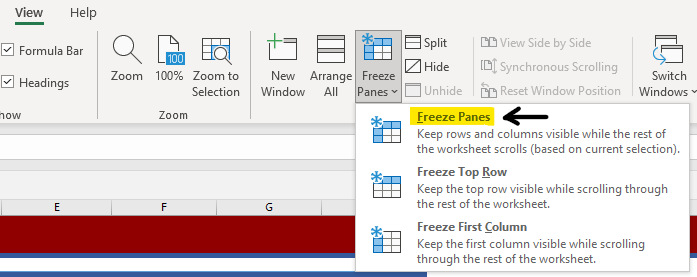 | 3. Select the view tab, then Freeze Panes as highlighted below: | ||||||