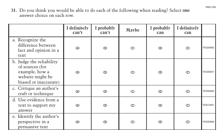 Due to the addition of the Learning Recovery Items, and to further reduce the expected response time at Grade 12, this Item was selected to be dropped. |