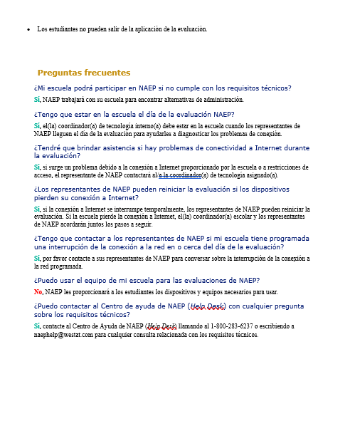 Si tiene preguntas técnicas sobre la encuesta, comuníquese con el Centro de Ayuda de NAEP (Help Desk) llamando al 1-800-283-6237 o escribiendo a naephelp@westat.com.
