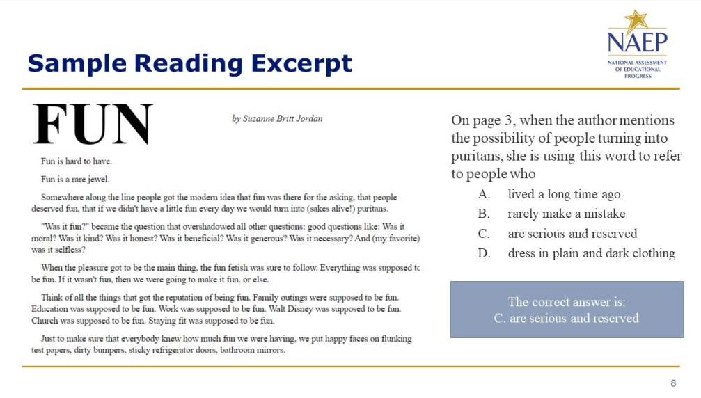 The National Assessment of Educational Progress (NAEP) is an integral measure of academic progress across the nation and over time. It is the largest nationally representative and continuing assessment of what our nation’s students know and can do in various subjects such as civics, science, mathematics, reading, and U.S. history. The program also provides valuable insights into students’ educational experiences and opportunities to learn in and outside of the classroom.