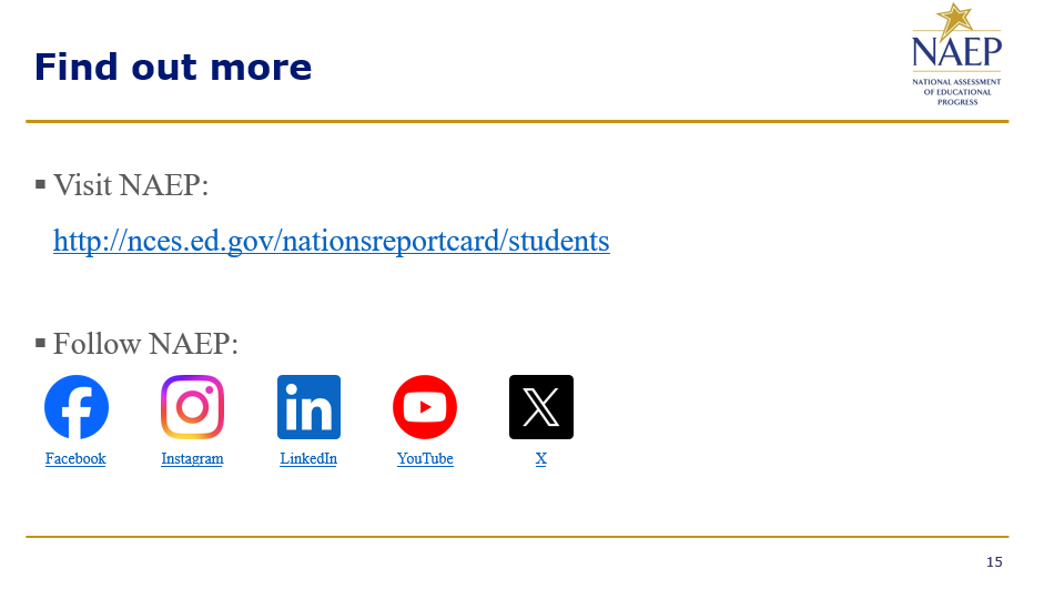 Additional information on the NAEP program and its data collection process, including health and safety protocols, is available from NAEP State Coordinators and through the NAEP website at http://nces.ed.gov/nationsreportcard.
