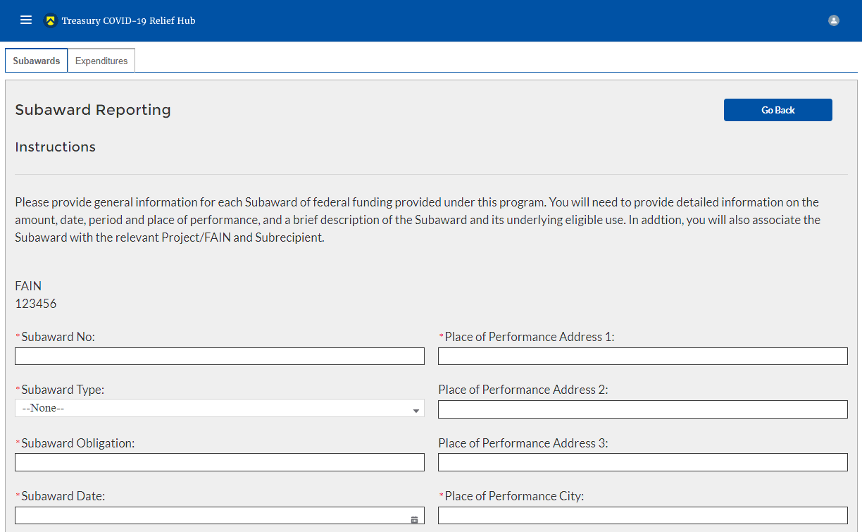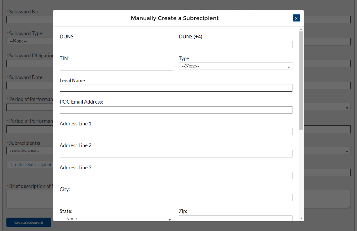 Manually enter the following fields pertaining to the Subawards: Subaward Number, Subaward Obligation, Subaward Date, Period of Performance Start, Period of Performance End, Place of Performance Address, City, State, Zip+4, Country, and Congressional District.