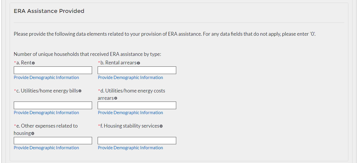 In this Module, each State, Local and Territorial Recipient must submit a data file containing the household-level information described below for each ERA assistance payment made to or on behalf of each participant household during the reporting period. The Financial Assistance expenditure category includes payments made by State, Local or Territorial Recipients and by all subrecipients and contractors for rent, rental arrears, utility/home energy services, utility/home energy services arrears, and other housing services and eligible expenses.