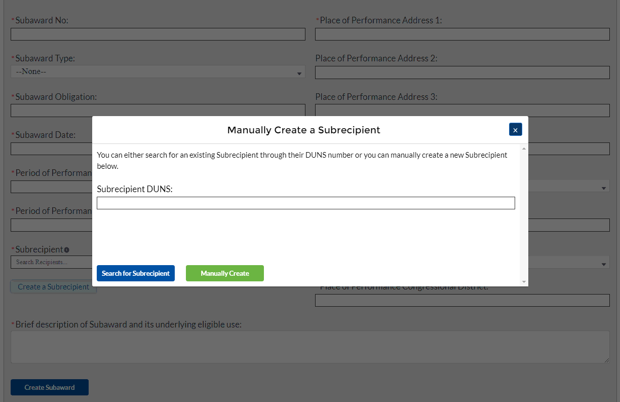 You can either search for the Subrecipient if you have already created it, or click Manually Create if it is your first time entering the DUNS.