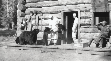 Three bears being fed by a member of the kitchen staff, another kitchen staffer in doorway of log structure at Crater Lake, William G. Steel sitting looking on. @ http://www.craterlakeinstitute.com/index-of-images/the-nps-focus-collection/