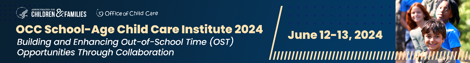 PAPERWORK REDUCTION ACT OF 1995 (Pub. L. 104-13) STATEMENT OF PUBLIC BURDEN: The purpose of this information collection is to obtain feedback from participants in the OCC School-Age Child Care Institute 2024. Public reporting burden for this collection of information is estimated to average 10 minutes per respondent, including the time for reviewing instructions, gathering and maintaining the data needed, and reviewing the collection of information. This is a voluntary collection of information. An agency may not conduct or sponsor, and a person is not required to respond to, a collection of information subject to the requirements of the Paperwork Reduction Act of 1995, unless it displays a currently valid OMB control number. The OMB # is 0970-0401 and the expiration date is 5/31/2027. If you have any comments on this collection of information, please contact Stacy Cassell, stacy.cassell@acf.hhs.gov.