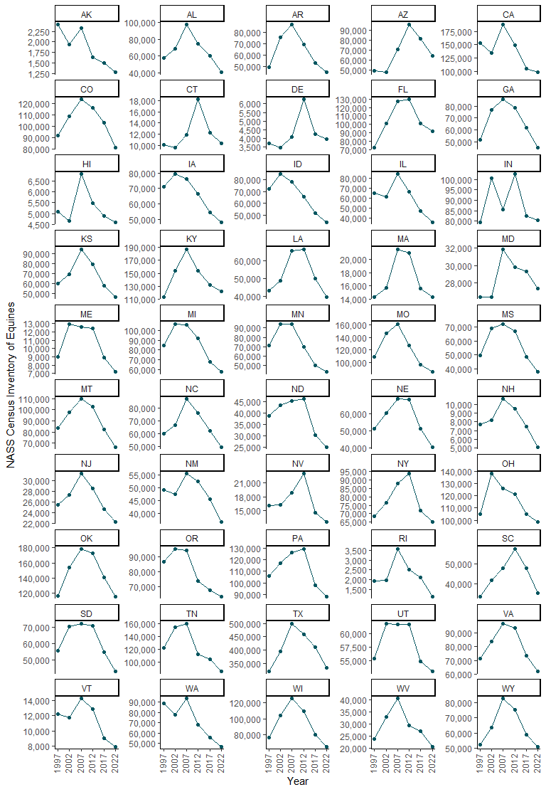 State selection for Phase I of the study was considered based on the percentage of equine inventory and operations, equine density, and the trends of the counts of equine inventory and operations, by State. Population counts were taken from the 2022 Census of Agriculture data. The overall inventory and operation counts, by operation size, are given in Table A.1, while State-level inventory and operation counts, percentages, and equine density are presented in Table A.2. Historical equine inventory and numbers of equine operations were taken from the same two reports and are depicted in Figures A.1–A.2. For comparison, the States included in previous NAHMS Equine studies are included in Figure A.3 and the proposed regions for the Equine 2026 Study are depicted in Figure A.4.