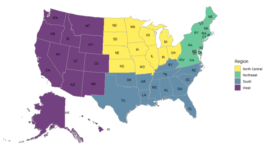 West (Alaska, Arizona, California, Colorado, Hawaii, Idaho, Montana, New Mexico, Nevada, Oregon, Utah, Washington, Wyoming)