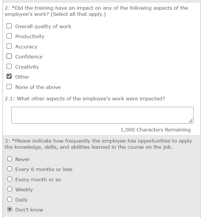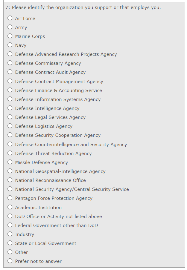 The screen capture images that follow show ALL of the questions included in the survey. Questions numbered with decimals (i.e., 1.1, 1.2, 1.3, and 2.1) are only displayed when the preceding response option is selected, triggering the display logic for the sub-question. For example, selecting the response option “Other, please specify.” triggers display of a follow-up question and open-ended response text box.