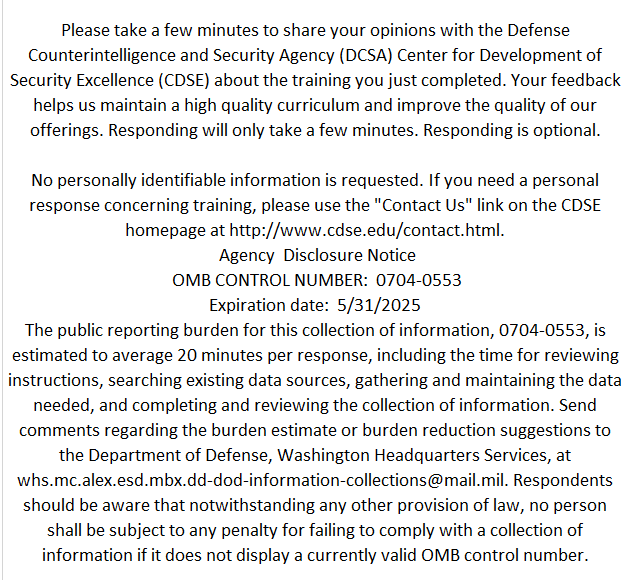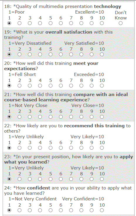CDSE Instructor Led Class Student Evaluation Survey Screen