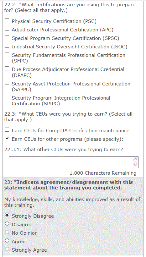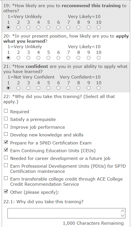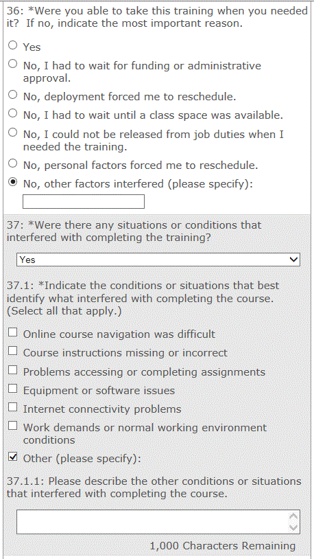 The screen capture images that follow show ALL of the questions included in the survey. Questions numbered with decimals (22.1, 22.2, 22.3, 22.3.1, 24.1, 25.1, 26.1, 27.1, 28.1, 29.1, 30.1, 30.2, 31.1, 32.1, 33.1, 34.1, 35.1, 37.1, and 37.1.1) are only displayed when the preceding response option is selected, triggering the display logic for the sub-question. For example, selecting the response option “Other, please specify.” triggers display of a follow-up question and open-ended response text box.