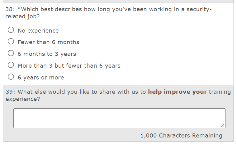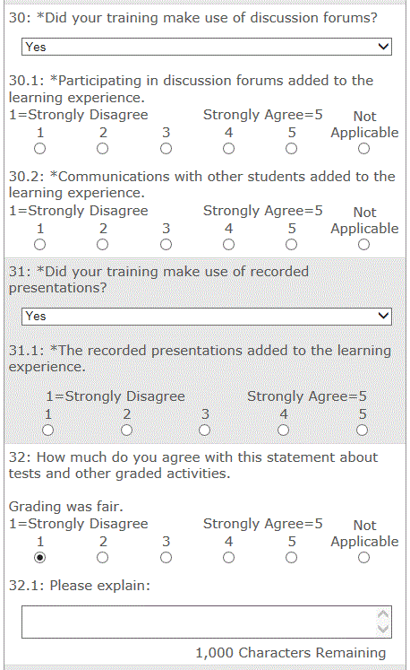 The actual survey appears as one web page; this enables the respondent to view the entire set of questions, except the questions that appear only when a specific option is selected. The pagination of this document accommodates the screen capture images.